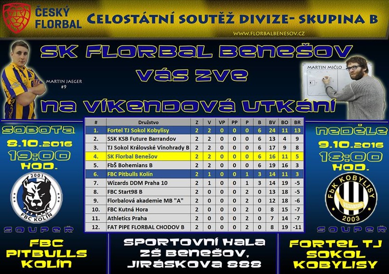 V sobtou a v neděli se na benešovské půdě odehrají další dvě kola flobralové divize. Benešovské "A" mužstvo v sobtou hostí od 19:00 FBC Pitbulls Kolín. V neděli pak do Benešova zavítá celek z pražských Kobylis. Utkání začíná v 18:00.
