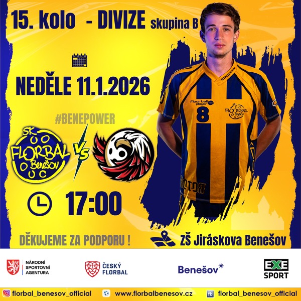 SK Florbal Benešov vs. Sokol Benátky n/J ve 14:20 hodin.
